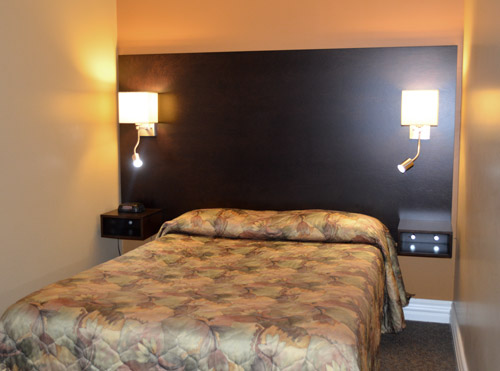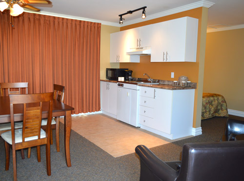 Chambre à 1 lit Queen, cuisinette avec cuisinière et réfrigérateur, balcon avec vue sur la mer. Accès direct au stationnement.